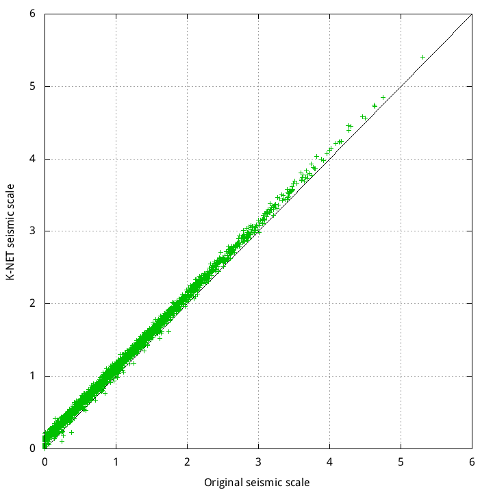 - 2 * log10(gal) + 0.94 で震度を算出(gal は 0.3 秒間継続した合成加速度[gal])